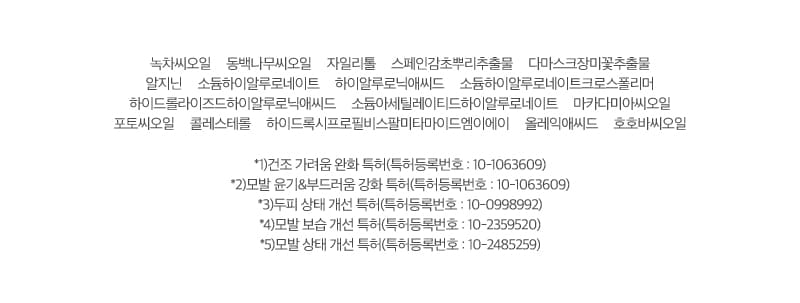 *1)건조 가려움 완화 특허(특허등록번호 : 10-1063609) *2)모발 윤기&부드러움 강화 특허(특허등록번호 : 10-1063609) *3)두피 상태 개선 특허(특허등록번호 : 10-0998992) *4)모발 보습 개선 특허(특허등록번호 : 10-2359520) *5)모발 상태 개선 특허(특허등록번호 : 10-2485259)