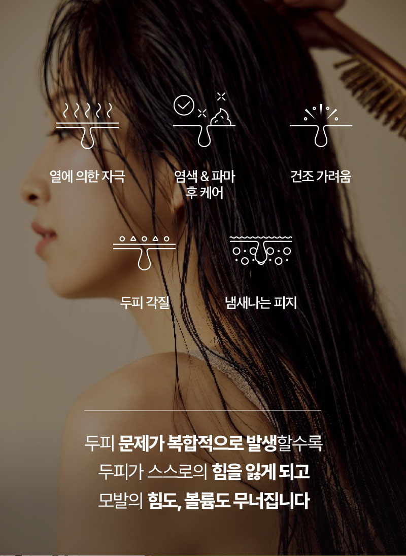 두피 문제가 복합적으로 발생할수록 두피가 스스로의 힘을 잃게 되고 모발의 힘도, 볼륨도 무너집니다
